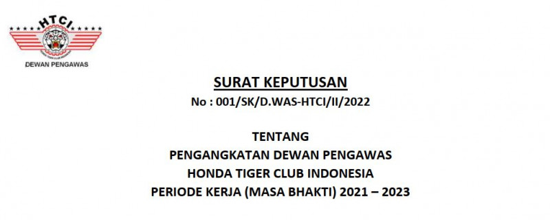 B erdasarkan Ketetapan MUNAS X HTCI No: 013/TAP/MUNASX/XII/2021 tentang hak Ketua Dewan Pengawas HTCI terpilih untuk membentuk keanggotaan maka Dewan Pengawas mengeluarkan Surat Keputusan Pengangkatan Anggota Dewan Pengawas Honda Tiger Club Indonesia Periode Kerja (Masa Bhakti) 2021 - 2023.